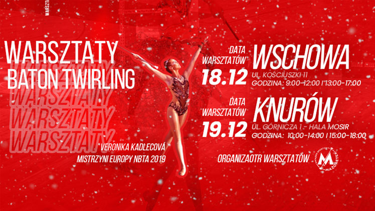 W dniach 18.12.2021 oraz 19.12.2021 Veronika Kadlecová – Mistrzyni Europy NBTA 2019 przeprowadzi warsztaty Baton Twirling. Dnia 18.12 warsztaty odbędą się w Wschowie na ul. Kościuszki 11 w godzinach 9:00-12:00 oraz 13:00-17:00 Dnia 19.12 warsztaty odbędą się w Knurowie na ul. Górnicza 1 (hala MOSiR) w godzinach 10:00-14:00 oraz 15:00-18:00